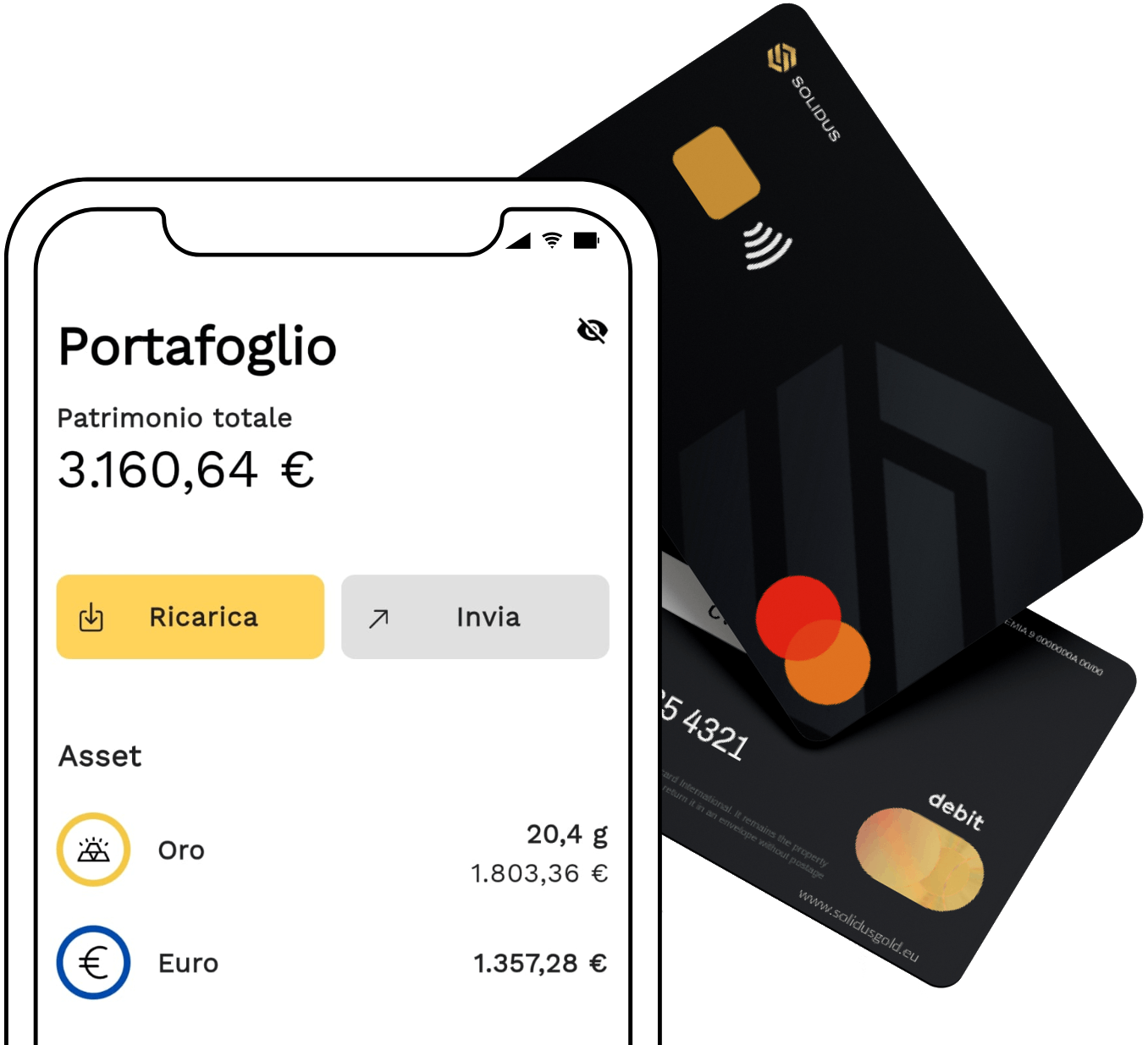 Richiedi una carta di debito Mastercard, fisica o virtuale, collegata al conto oro Solidus per pagare ovunque. Se il saldo in euro è zero, Solidus converte istantaneamente l’oro necessario per il pagamento.